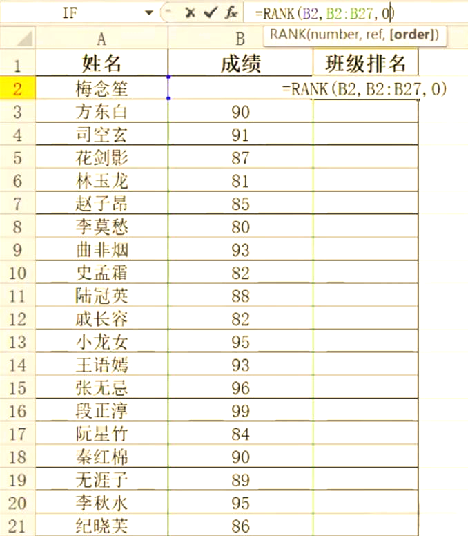 1在WPS表格中输入姓名成绩rank函数的用法,需要根据成绩计算排名和等级2选择“C2”单元格并点击“fx”插入“rank”函数3按下图输入函数参数,转换成公式为=RANKB2,$B$2$B$94点击确定并下拉公式即可生成对应成绩的排名情况5然后在D2单元格输入等级公式=IFB2=90,quot优秀quot,IFANDB2=80,B2lt90,quot良好quot,IFANDB2=60,B2lt80,quot。